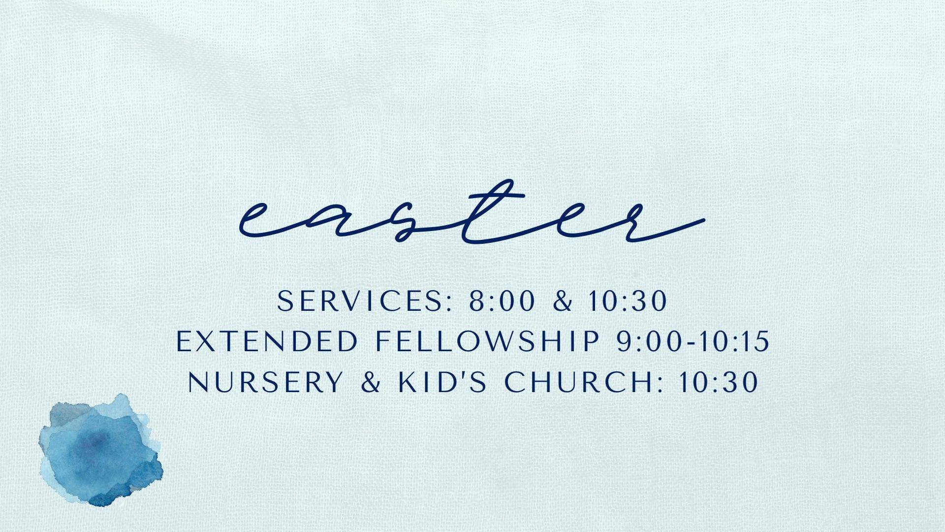 Easter Sunday (April 5th): 8:00 & 10:30 am - Worship in the Sanctuary. 9:00-10:15 am - Extended Breakfast Fellowship in FLC. No Sunday School. 10:30 am - Childcare available for Birth to 5th Grade in the FLC.